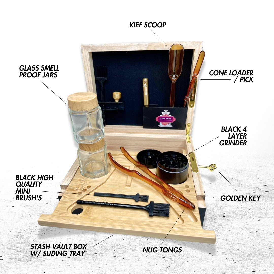 Each purchase includes the full storage set! two smell-proof jars, two high-quality brooms that pair perfectly with the sliding tray, 4-layer aluminum grinder, one golden key and bonus accessories —making it the best stashbox on the market!